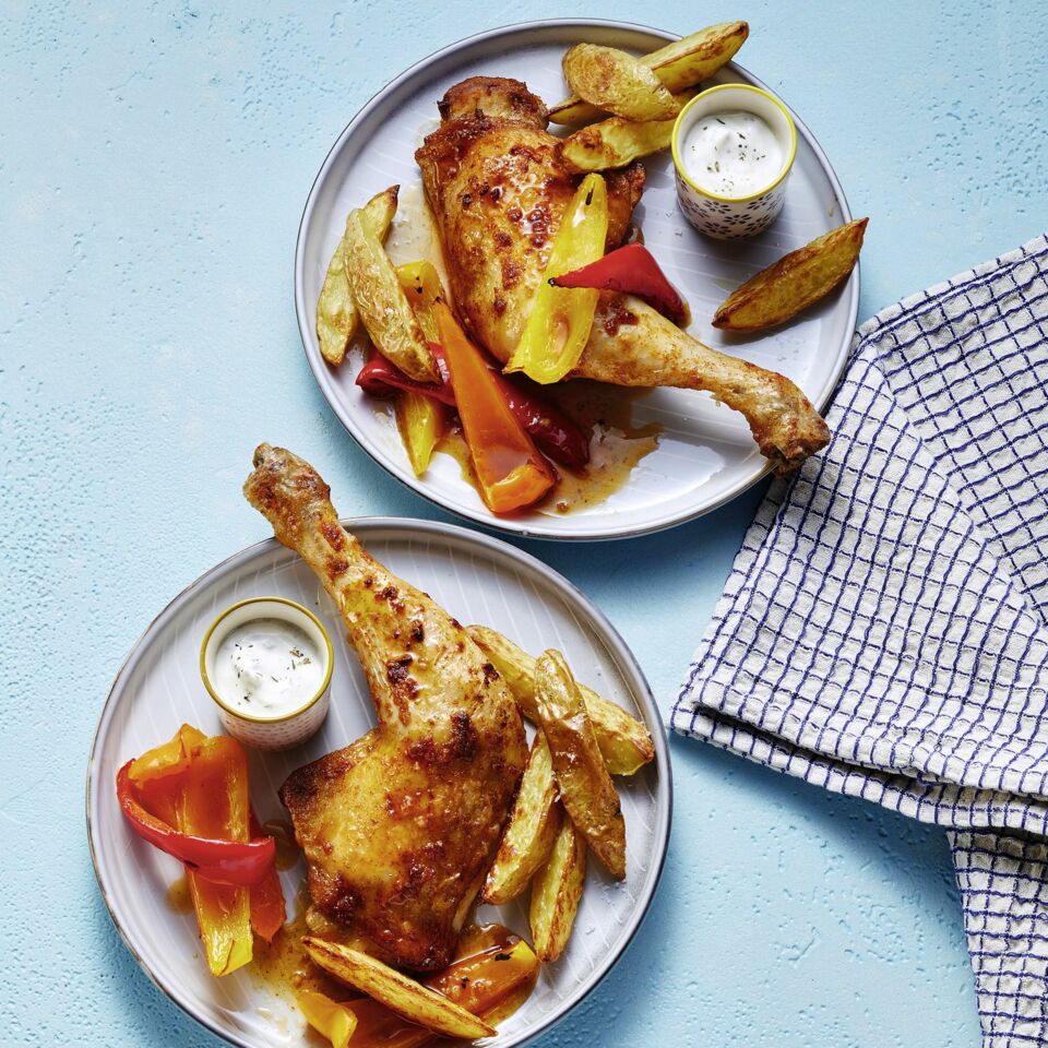 baked potatoes und paprika vom blech mit rucola mandel dip