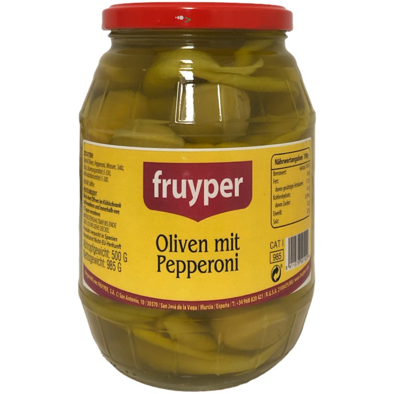 Fruyper grüne Oliven mit Stein und Pepperoni (500g Glas ATG)