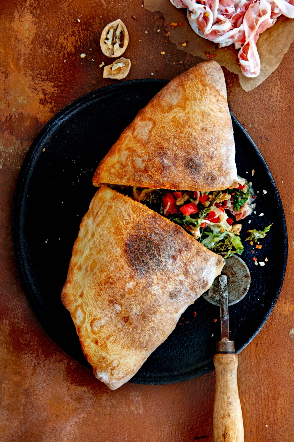 'Pizza calzone' rellena de verduras y jamón serrano